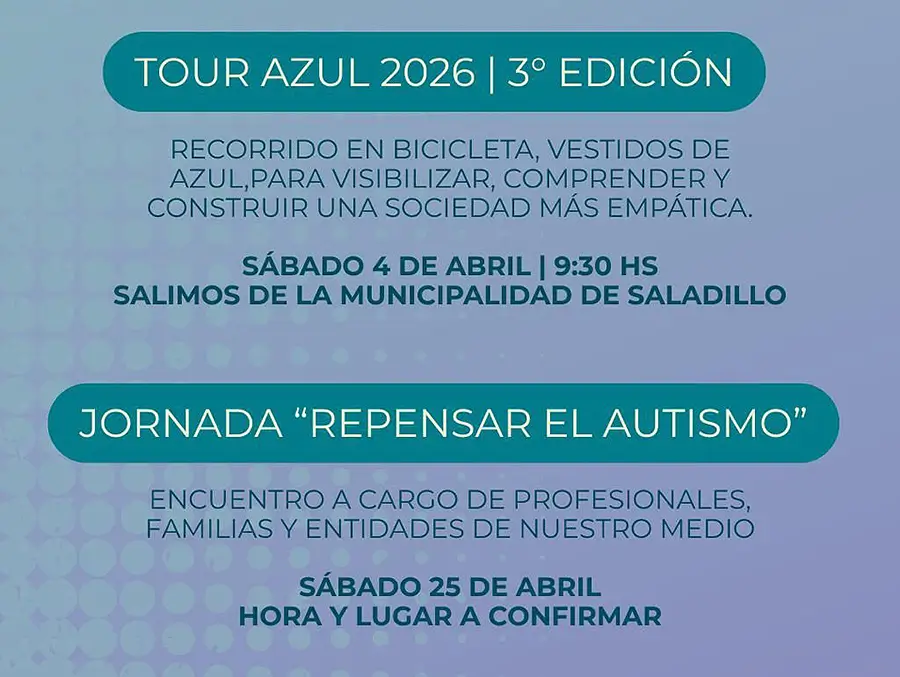 Se realizará un recorrido en bicicleta, invitando a los participantes a asistir vestidos de azul, con el objetivo de visibilizar, comprender y construir una sociedad más empática. Sábado 4 de abril, 9:30, salida desde la Municipalidad de Saladillo.
