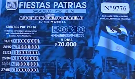 Desde hace dos semanas, ya se pueden conseguir las entradas para las 32° Fiestas Patrias de Saladillo, que se llevarán a cabo del 8 al 12 de julio en el predio de la Sociedad Rural.