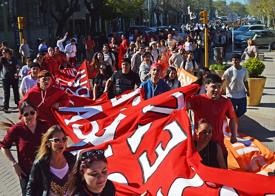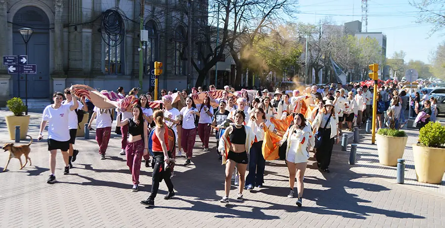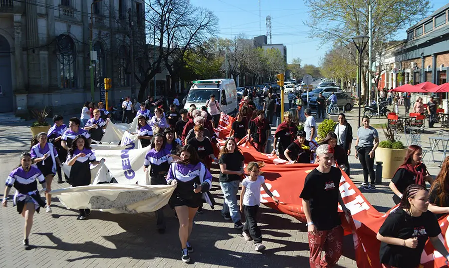 Una prolongada columna con egresados de todas las escuelas secundarias, incluidas Del Carril, Cazón y Polvaredas, inició el recorrido en La Trocha con banderas multicolores y se dirigió por avenida Rivadavia hasta la plaza principal, donde se realizó una bulliciosa concentración.