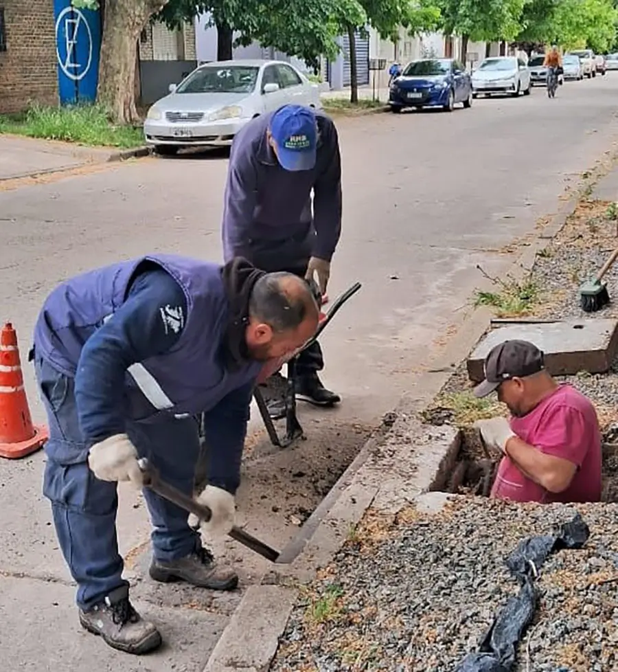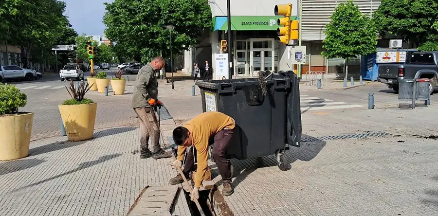 Paralelamente, se lleva a cabo un trabajo intensivo de limpieza de bocas de tormenta, tal es el caso de la esquina de Hipólito Yrigoyen y Julio Roca.