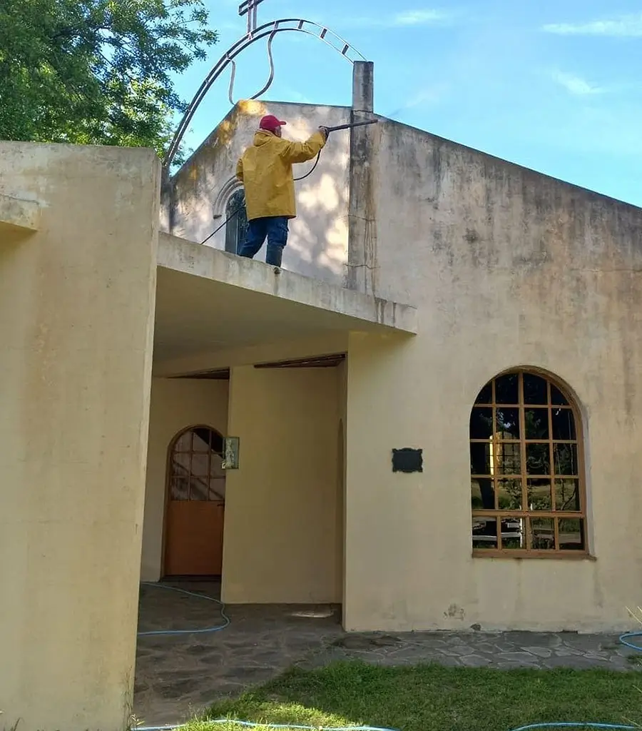 La cuadrilla de pintura se encuentra realizando hidrolavado, reparación de revoques y pintura en la Capilla Nuestra Señora Del Rosario en la localidad de Cazón.