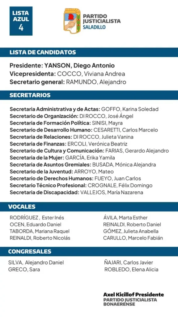 “Presentamos esta lista para las elecciones internas del Partido Justicialista de Saladillo con una invitación clara: recuperar juntos el Partido, abrir las puertas, volver a escucharnos y poner al afiliado en el centro de cada decisión”, expresaron.