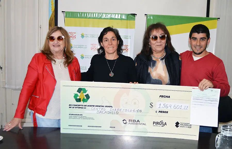 Un cheque por más de 1.500.000 pesos recibió este lunes el Centro Diabetológico Saladillo (CEDIS) de manos del Municipio, tras la recolección de aceite vegetal usado que, a través del programa Bio, realiza todos los meses la empresa marplatense RBA-Ambiental.