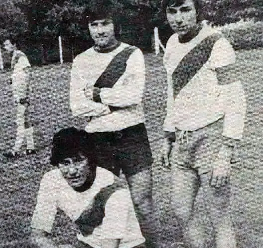 Julio (hincado) junto al Vasco Olarticoechea y el Tanque Tenaglia vistiendo la camiseta de Argentino