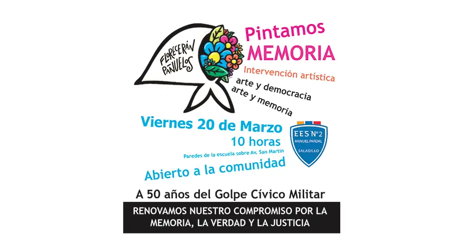 A 50 años del golpe de Estado, la Dirección de la Escuela Secundaria 2 Manuel Pardal (ex Colegio Nacional) de Saladillo, invita a la comunidad educativa y ex alumnos de la institución a la jornada Pintamos Memoria, donde se realizará junto a estudiantes y familias una intervención artística sobre el paredón de avenida San Martín.