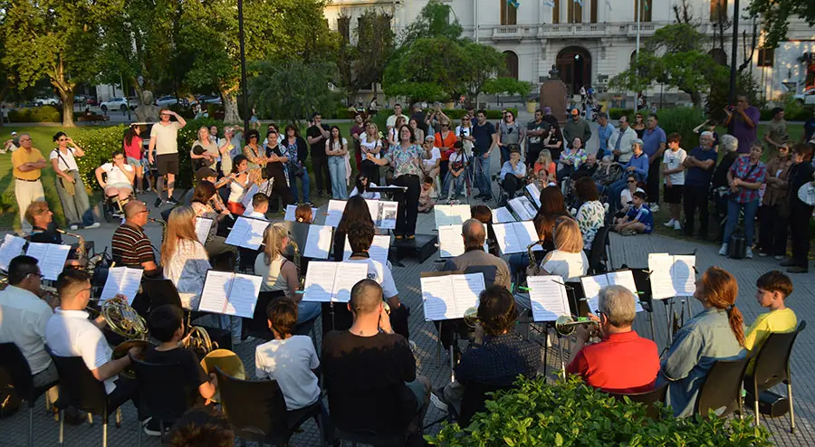 Alrededor de 30 músicos hicieron sonar sus instrumentos de viento, deleitando al numeroso público que los fue a disfrutar al mástil de la plaza.