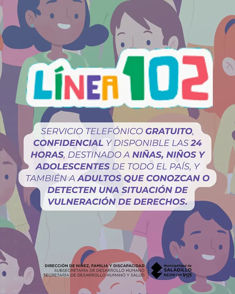 Ante situaciones de violencia o vulneración de derechos, la Dirección de Niñez, Familia y Discapacidad del Municipio de Saladillo recordó que la Línea 102 es un servicio telefónico gratuito, confidencial y disponible las 24 horas, destinado a niñas, niños y adolescentes de todo el país y también adultos.