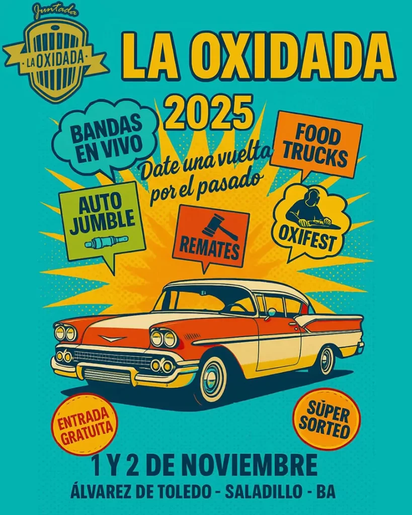 La Oxidada 2025, en su 9na edición, se llevará a cabo el fin de semana del 1° y 2 de noviembre. “Nos encontraremos en Álvarez de Toledo – Saladillo (BA) para vivir la fiesta de los motores más grande de la región”, anunciaron los organizadores de la juntada.
