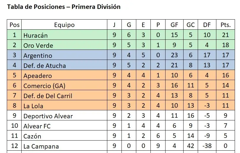Con estos resultados, el líder es Huracán con 25 unidades, escoltado por Apeadero con 19; Argentino 17; Cazón 14; Comercio y La Lola 12; Atucha, Oro Verde y Alvear FC 10; Del Carril 8; Deportivo 7; y La Campana 0.