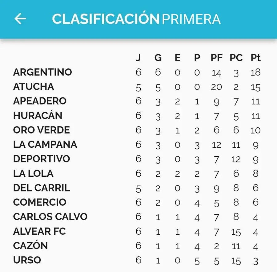 Con estos resultados, Argentino lidera en soledad con 18 puntos, escoltado por Atucha con 15, Apeadero y Huracán 11, Oro Verde 10, La Campana y Deportivo 9, La Lola 8, Del Carril y Comercio 6, Carlos Calvo, Alvear FC y Cazón 4 y cierra Urso con 3.