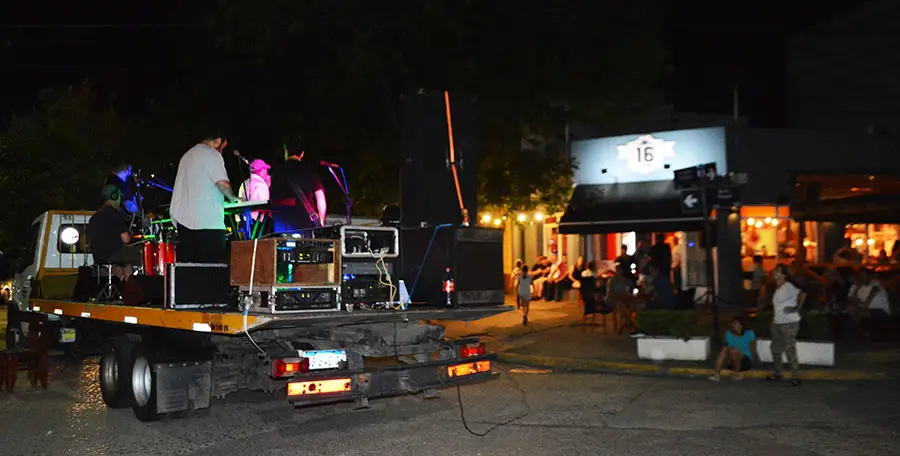 En cada parada, subido al chasis de una grúa, el grupo tocó aproximadamente una hora, ofreciendo un amplio y variado repertorio que el público, entre birra y birra, disfrutó a pleno.