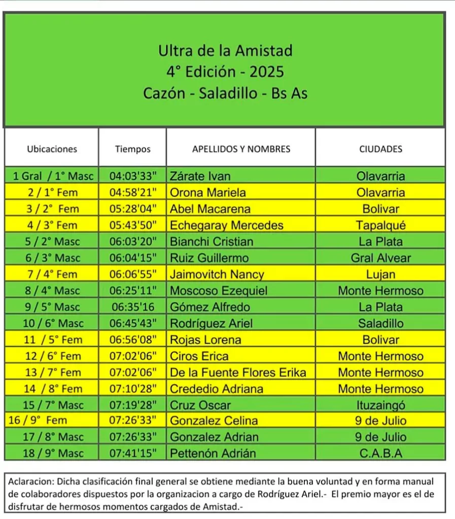 Con respecto a los resultados, el primer puesto de la clasificación general fue para el atleta Iván Zárate, mientras que en damas se impuso Mariela Orona, ambos de Olavarría.