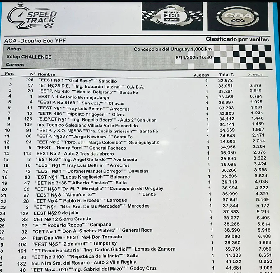 La Escuela Técnica “Gral. Savio” de Saladillo logró este sábado primer puesto con su auto eléctrico Pantera, en la carrera Challenge del Desafío ECO YPF, en Concepción del Uruguay.