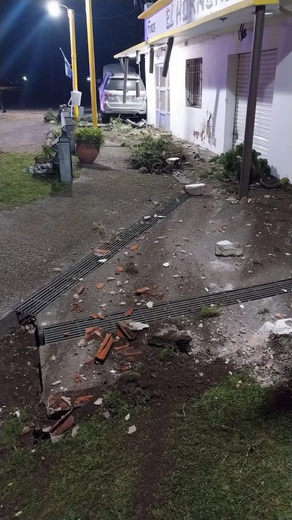 De acuerdo a las imágenes captadas por el periodista Abel Barth, del portal Roque Pérez Hoy, la camioneta quedó detenida sobre unos pilotes de madera, arrasando a su paso con maceteros y postes que sostienen el techo de la galería.