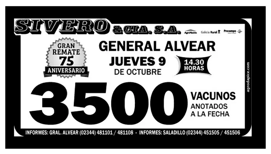 Las ventas por el 75° Aniversario de la casa martillera tendrán lugar el jueves 9 de octubre, desde las 14:30, en la Sociedad Rural de General Alvear.