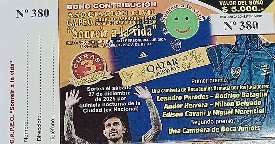 Gracias al aporte desinteresado de la peña xeneize Late un Corazón Azul y Oro de Saladillo, el Grupo de Ayuda al Paciente Oncológico (GAPEO) Sonreír a la Vida de esta ciudad lanzó un bono contribución, cuyos premios son una camiseta y una campera de Boca Juniors autografiadas por jugadores en actividad.