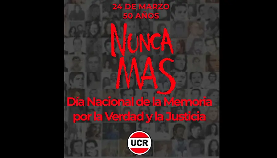 A 50 años del inicio de la última dictadura militar, el período más oscuro de nuestra historia que impuso el terror, la censura y el silencio, desde la Unión Cívica Radical reafirmamos una posición firme y activa en defensa de la democracia y el Estado de Derecho, sosteniendo como banderas irrenunciables la memoria, la verdad y la justicia.
